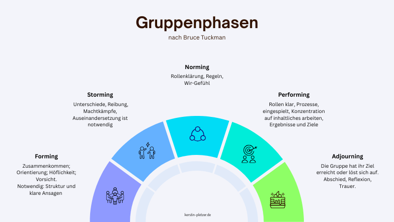 Adjourning (Auflösungsphase): Die Gruppe hat ihr Ziel erreicht oder löst sich auf. Es geht um Abschied, Reflexion und oft auch um Trauer. Was haben wir erreicht? Was nehmen wir mit? Wie trennen wir uns? Diese Phase wird oft unterschätzt, ist aber wichtig für einen guten Abschluss.